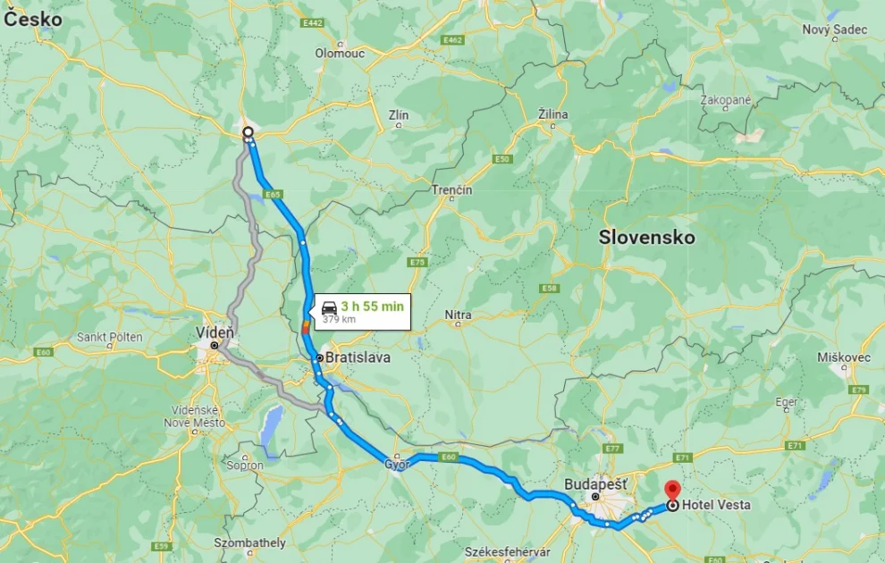 Wyruszyliśmy samochodem około 12:30 i obliczyliśmy, że nawet z przerwami na kawę jazda zajmie nam około 5 godzin. Z Brna wyruszamy w kierunku Bratysławy, a następnie do Györ, Tatbánya i autostradą M1 do Budapesztu. Następnie kontynuowaliśmy podróż przez miasta Györmö i Mende. Po przejechaniu wioski Sülysáp po prawej stronie w lesie zobaczyliśmy wieżę, która jest dominującym elementem hotelu Vesta. Po około 100-200 metrach po prawej stronie pojawił się drogowskaz. Po zakręcie droga jest dosłownie gruntowa, ale nie martw się, zaprowadzi Cię bezpośrednio do hotelu. Ze względu na korki po wypadkach na węgierskich autostradach podróż trwała nieco dłużej niż planowałem. Kiedy wracaliśmy w ostatni weekend sierpnia, dla odmiany zastaliśmy duży ruch jadący z południa Europy do Austrii i Niemiec.
