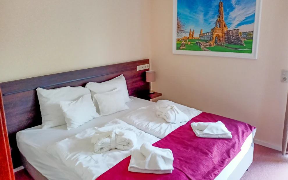 Zakwaterowano nas w dużym pokoju/apartamencie rodzinnym z dwiema sypialniami. W większej sypialni znajdowało się dwuosobowe łóżko, lodówka, telewizor, fotel, duża szafa i stół. W mniejszej sypialni znajdowało się jedynie podwójne łóżko i stolik z telewizorem. Za stolikami nocnymi znajdowały się oczywiście lampki nocne i szuflady. Pokoje miały wspólny duży balkon z widokiem na baseny, plac zabaw i staw. Były też dwa leżaki, suszarka na ubrania (ręczniki i szlafrok) oraz stół z 4 krzesłami. Na balkonie można było zapalić lampę zewnętrzną, aby móc wieczorem posiedzieć. Łazienka była przestronna z dużą umywalką i prysznicem. Tutaj czekały na nas także mydła, żele pod prysznic, szlafroki i białe ręczniki.