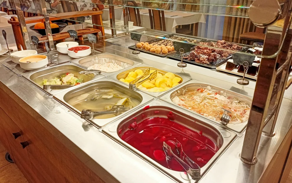 W wieczornym bufecie do wyboru były dwie zupy i co najmniej 3 dania główne (na przykład wołowina z sosem, gulasz, sznycle) oraz dodatki (ryż, pieczone ziemniaki, krokiety itp. W cenę wliczone były posiłki dla dzieci. Urozmaicona była także oferta warzyw, m.in. ogórków kiszonych, buraków, kalmary. Miłośnicy słodkości mogli wybierać spośród co najmniej 3 rodzajów deserów. Napoje nie były wliczone w cenę, więc do pokoju zamówiliśmy co chcieliśmy - piwo z beczki, lemoniadę i tym podobne. Jeżeli po obiedzie dzieci nadal były głodne, obsługa nie miała problemu z zabraniem czegoś z bufetu na tacę w pokoju.