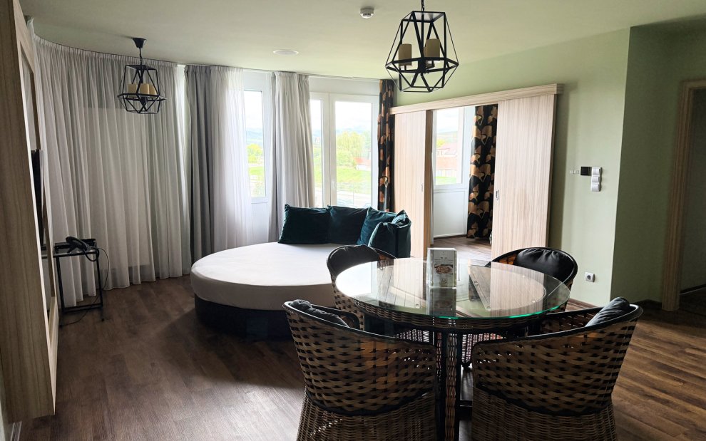 Nasz apartament typu studio był naprawdę przestronny (ponad 60 m²) i wszystko zostało przemyślane z myślą o komforcie rodziny z małym dzieckiem. Składał się z sypialni z podwójnym łóżkiem, salonu z dużą, okrągłą sofą, aneksu kuchennego oraz łazienki z przestronnym prysznicem. Do dyspozycji był również duży balkon, z którego mogliśmy podziwiać otaczającą nas przyrodę. Komfort dodawały nie tylko eleganckie wnętrze, ale także nowoczesne technologie, takie jak dostęp do Netflixa i wbudowany głośnik Bluetooth. W łazience mogłam słuchać ulubionej muzyki. Wysokiej jakości materace, pościel i zaciemniające zasłony zapewniały naprawdę spokojny sen, co jest nieocenione podczas podróży z małym dzieckiem. Był tam również minibar, kawa, herbata i czajnik elektryczny, więc czuliśmy się jak w domu i niczego nam nie brakowało.