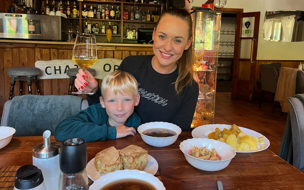 Obiadokolacje również odbywały się w formie bufetu i miały podobnie przyjemną atmosferę jak śniadania. Każdego wieczoru zaczynaliśmy od zupy, następnie podawaliśmy danie główne z kilkoma dodatkami, a zawsze mogliśmy sobie pozwolić na coś ekstra – sałatki, kanapki czy domowy deser. Ogólnie rzecz biorąc, posiłki były lekkie, smaczne i bardziej przypominały kuchnię domową niż hotelową, co nam odpowiadało. Kolejną wielką zaletą była nielimitowana konsumpcja napojów bezalkoholowych i piwa za darmo (8:00–11:00 i 18:00–20:00). Za niewielką dodatkową opłatą, ja i moja mama mogłyśmy również delektować się lampką wina lub drinkiem z baru. Chwalę również podejście do alergii – zaraz po przyjeździe recepcja pytała, czy coś wymaga dostosowania.