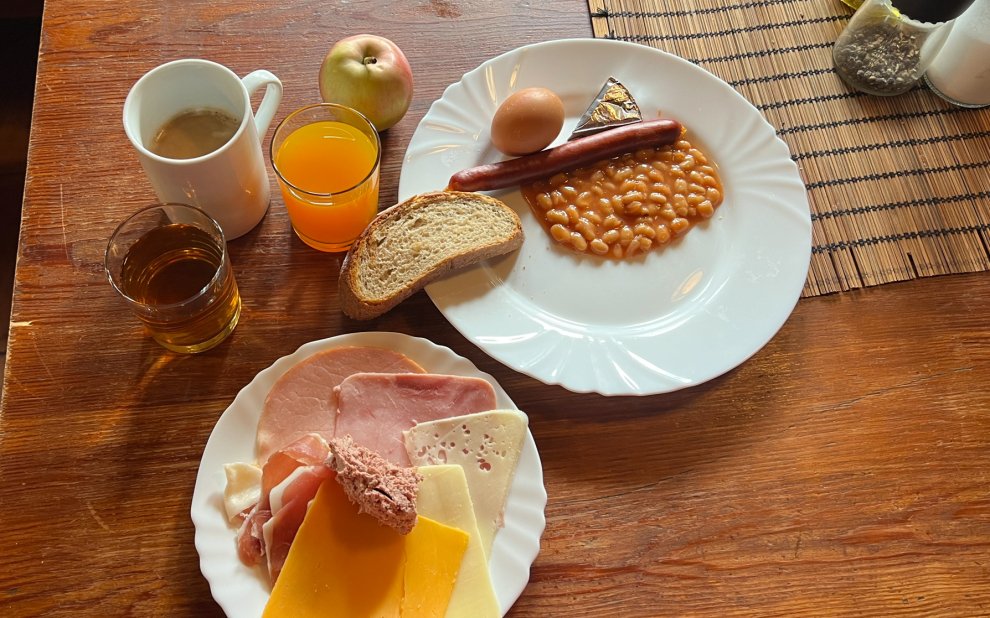 Szczerze mówiąc, nie spodziewałem się niczego nadzwyczajnego po jedzeniu w schronisku górskim – raczej prostych dań, które nasycą po dniu spędzonym w górach. Ale jeszcze bardziej zaskoczyła mnie wysoka jakość i różnorodność lokalnej kuchni. Nasz pakiet pobytowy obejmował bufet z nielimitowanymi napojami rano i wieczorem. Jedzenie serwowane jest w przytulnej restauracji na parterze domku, która dysponuje również przestronnym tarasem z panoramicznym widokiem na Karkonosze. W ładną pogodę posiłki na świeżym powietrzu to wspaniałe doświadczenie, dodające do dobrego jedzenia sporą dawkę górskiego klimatu.