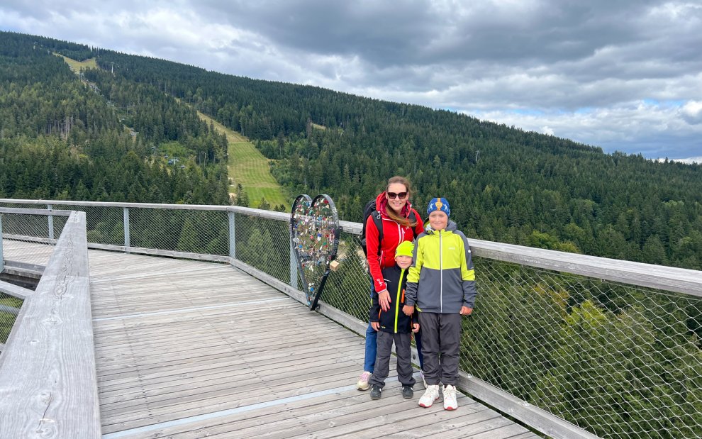 - Karkonoska Ścieżka w Koronach Drzew – Ze wszystkich wycieczek, dzieciom najbardziej spodobała się ta do pobliskich Jańskich Łaźni, gdzie odwiedziliśmy 45-metrową wieżę widokową z fantastycznym widokiem na całą okolicę. Synowie urozmaicili wejście na trasę, robiąc przystanki na ścieżce edukacyjnej.