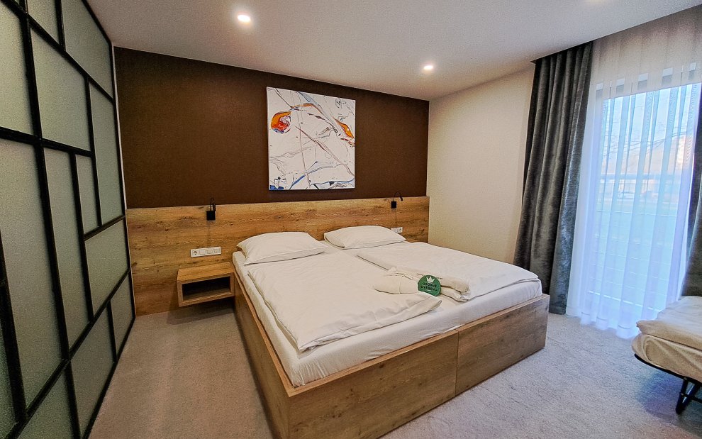 Czterogwiazdkowy Hotel Magnus położony jest w spokojnej części Trenczyna, a jednocześnie do centrum można dojechać samochodem w ciągu kilku minut. Muszę przyznać, że pokój hotelowy miło nas zaskoczył - był naprawdę duży i nowocześnie urządzony. Dodatkowo została podzielona parawanem na część dzienną i sypialną. W części dziennej znajdował się telewizor z częścią wypoczynkową, zaś w części sypialnej czekało na nas wygodne łóżko małżeńskie oraz dodatkowe łóżko. Dodatkową zaletą było to, że telewizor był dobrze widoczny zarówno z kanapy, jak i z łóżka. Było też dużo miejsca do przechowywania, lodówka, zestaw do parzenia kawy i herbaty oraz suszarka do włosów. Byliśmy również zadowoleni z kapci i szlafroka dla każdego z nas. Krótko mówiąc, pokój był tak urządzony, że nic nam nie umknęło.