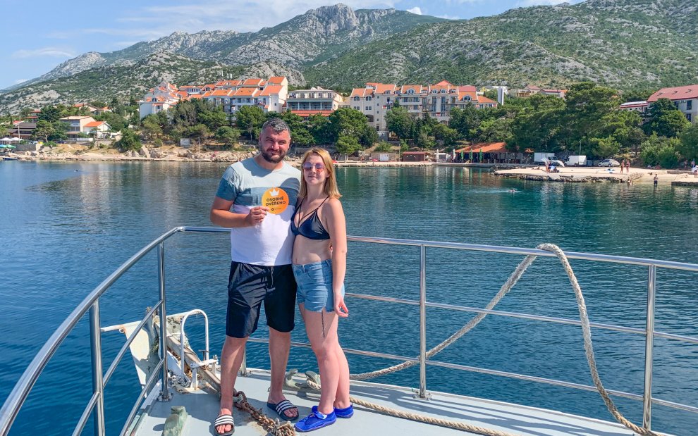 Piękna była także wycieczka łodzią o nazwie Marino. Statek odpływa o godzinie 10:00 i przypływa o 17:00. Przepływając kanałem pomiędzy Karlobagiem a wyspą Pag, widzieliśmy grupę delfinów pływających i wyskakujących z wody tuż przy łodzi, co było naprawdę wyjątkowym przeżyciem. Kapitan Branko podczas podróży podał nam lokalny napój alkoholowy „rakija” zmieszany z Fantą. Wycieczkę rozpoczęliśmy w miejscowości Pag na wyspie o tej samej nazwie, gdzie mieliśmy czas na zwiedzanie osady, zakup prezentów i zjedzenie dobrego lunchu w jednej z restauracji. Następnie łódź skierowała się do małej wioski rybackiej Metanja, gdzie pływaliśmy i delektowaliśmy się świeżo złowionymi owocami morza w portowej restauracji. W drodze powrotnej statek zatrzymał się na chwilę, abyśmy mogli jeszcze raz przepłynąć się w morzu i wskoczyć do wody z drugiego piętra statku.