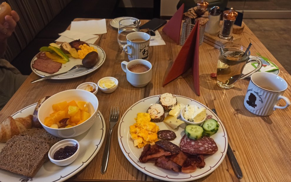 Z niecierpliwością czekaliśmy na posiłek w hotelu – opcja HB była przemyślana w najdrobniejszych szczegółach. Śniadanie w formie bufetu oferowało niezwykle zróżnicowany wybór, który zadowoli zarówno miłośników tradycyjnych smaków, jak i tych, którzy cenią lokalne specjały lub zdrowsze opcje. Stoły w formie bufetu były pełne świeżo sadzonej jajecznicy, bekonu, domowych wypieków, lokalnych serów i wędlin, różnych rodzajów masła (w tym wegańskiego i aromatyzowanego lawendą lub solą) oraz różnorodnych przypraw. Do tego słodkie wypieki, płatki śniadaniowe, płatki śniadaniowe, suszone owoce, a także różne rodzaje miodu i dżemów. Rano mogliśmy delektować się herbatą sypaną i porcjowaną, wodą smakową w karafkach (np. z węglem drzewnym lub cytryną) oraz kawą lub gorącą czekoladą.