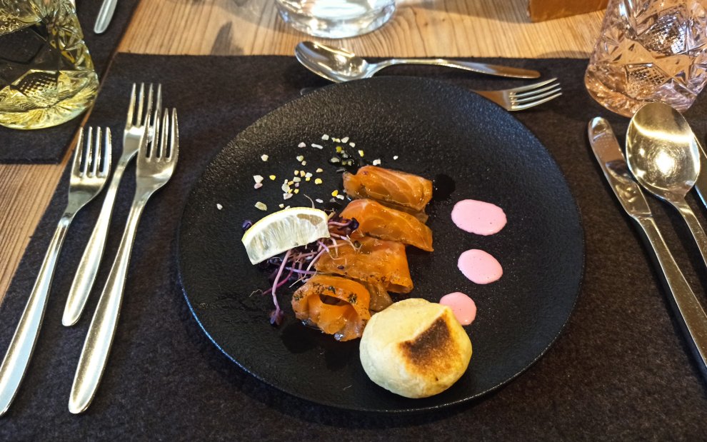 Wieczorem zamówiliśmy pięcio-daniowe menu z bufetem sałatkowym. Każdy pokój miał swój własny stół przez cały pobyt, co zwiększało komfort i prywatność. Kolacje były pięknie podane i oparte na regionalnych składnikach, w większości sezonowych i zawsze świeżych. W menu znalazły się dziczyzna, pstrąg z lokalnej rzeki, jagnięcina i typowe Schlipfkrapfen (domowy makaron faszerowany). Wegetarianie również znaleźli coś dla siebie, ponieważ każdego wieczoru dostępny był co najmniej jeden posiłek bezmięsny. Na koniec delektowaliśmy się tradycyjnymi austriackimi deserami, takimi jak Krapfen. Podczas kolacji skorzystaliśmy z opcji doboru win, co wyniosło doznania kulinarne na jeszcze wyższy poziom. Byliśmy zachwyceni jedzeniem hotelowym. Smakowało wyśmienicie, wyglądało pięknie i było widać, że zostało przygotowane z miłością.
