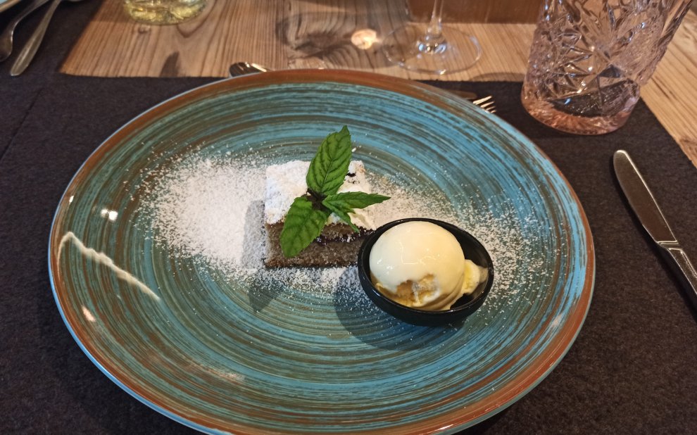 - Der Paternwirt – Skorzystaliśmy z faktu, że hotelowa restauracja jest czynna w ciągu dnia i oferuje możliwość zamówienia dań z karty. Na lunch zamówiliśmy knedel z boczkiem i deser – oba dania były równie pyszne, co posiłki w ramach opcji HB. Ceny również były rozsądne, więc polecamy.