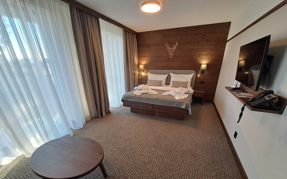 Podobał mi się nowoczesny wystrój nie tylko pokoju, ale całego hotelu. Głównym elementem było drewno, a w dekoracji dominowały jelenie, których było naprawdę wszędzie. Patrzyli na nas z góry z obrazów, wiszących ozdób, a nawet na wieszaku na ubrania widniała głowa jelenia i rogi.