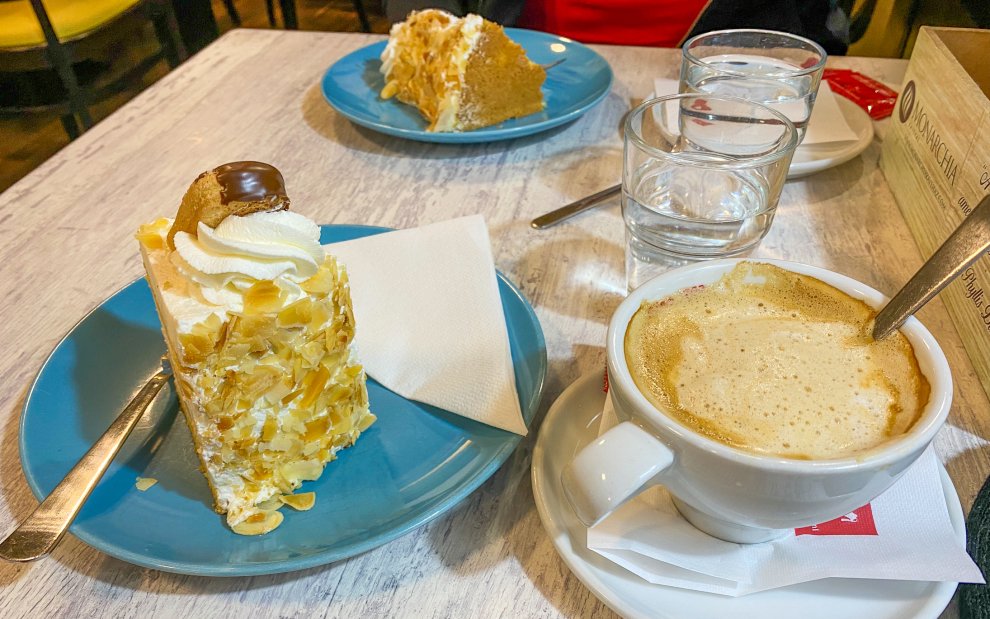 Z pobliskich restauracji odwiedziliśmy jedynie kawiarnię Monarchia Kávéház, która znajduje się 2 minuty spacerem od hotelu. Próbowaliśmy tutaj pysznego ciasta i cappuccino. Mają też duży wybór dań słonych, które można zjeść nie tylko na lunch.