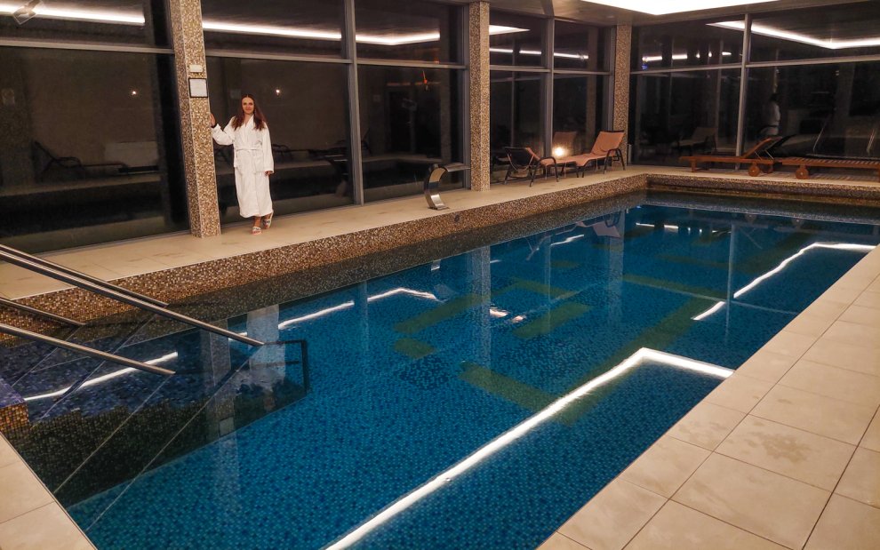 W hotelu znajduje się centrum wellness, które obejmuje duży panoramiczny basen, jacuzzi i saunę fińską, saunę ziołową i parową. Korzystałem głównie z basenu, który był świetny, woda w sam raz. Mąż woli sauny i jacuzzi. Wellness jest nowoczesny, przestronny, czysty i oceniamy go bardzo pozytywnie. Głównym plusem są długie godziny otwarcia, w tygodniu czynne jest od 10:00 do 22:00, w piątki i soboty centrum wellness czynne jest nawet do 23:00. Wieczorem jest tu mniej ludzi i możesz cieszyć się wellness w większej prywatności. Nie ma konieczności wcześniejszej rezerwacji wizyty. W pokoju znajdują się szlafroki i kapcie, dlatego w szlafroku można przejść bezpośrednio do strefy wellness łączącym korytarzem.