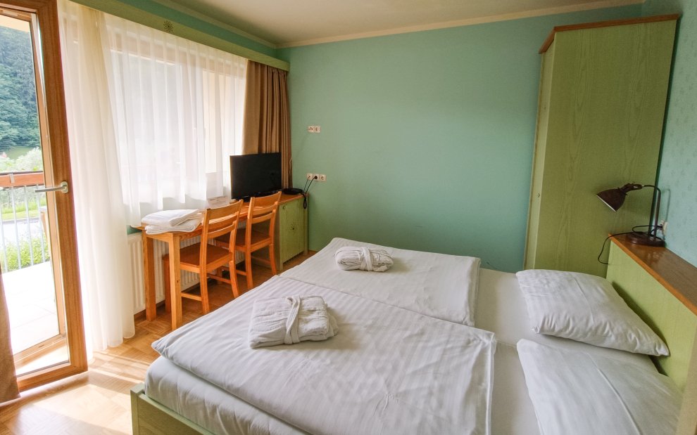W budynku głównym zlokalizowana jest wyłącznie recepcja, restauracja, baseny termalne i wellness, dlatego prosimy o pozostawienie bagażu w samochodzie podczas odprawy. Po zarejestrowaniu się w recepcji otrzymasz kartę chipową oraz numer swojego domu i pokoju (karta chipowa służy również do otwierania bramy przy wyjściu i wejściu do lokalu). Po zalogowaniu udaliśmy się do naszego mieszkania. Zakwaterowanie jest rozmieszczone w ośmiu oddzielnych domach rozmieszczonych na terenie hotelu. Każdy dom ma trzy piętra i ma własne wejście. Ponieważ domki są rozproszone po okolicy, spodziewaj się, że wyjdziesz na zewnątrz na śniadanie, kolację i do strefy wellness. Zakwaterowano nas w domu nr 3, do głównego budynku było zaledwie 200 metrów w dół.