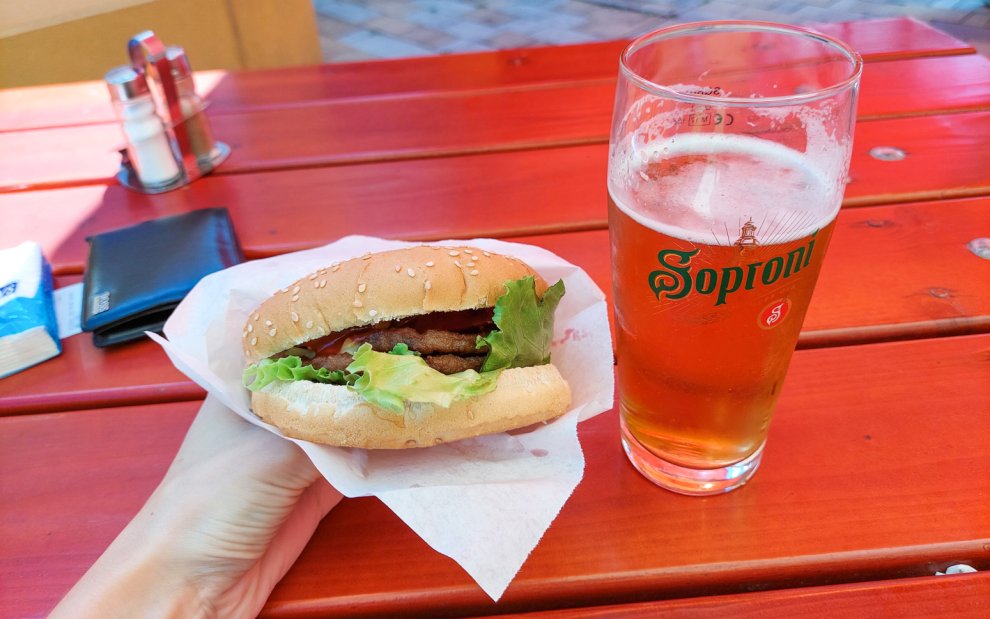 Sobotni lunch zjedliśmy bezpośrednio w strefie spa. Była tam jedna restauracja, a za nią bufet z fast foodami. Chcieliśmy spędzić jak najwięcej czasu w spa termalnym, więc tym razem nie wybraliśmy się do żadnej restauracji poza kompleksem spa. **Udaliśmy się do bufetu, gdzie zjedliśmy lángos, hamburgera i lokalne piwo z beczki. Później wciąż byliśmy głodni, co rozwiązaliśmy jedząc lody w zewnętrznej części kompleksu.