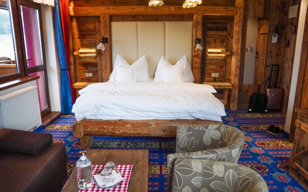 Nasz pokój znajdował się na trzecim piętrze i był naprawdę przestronny. Dominującym elementem było duże drewniane łóżko z puszystą pościelą. Ale było też biurko z krzesłem, duża drewniana szafa i komoda, stolik kawowy i wygodna kanapa z fotelami. Oczywiście był też telewizor, ale przez cały nasz pobyt nawet go nie włączaliśmy. Miłą niespodzianką była na stole karafka z wodą i szklankami, a także mini barek z różnymi napojami w bardzo przyjaznych cenach. Łazienka była również ogromna z prysznicem, dużą ilością ręczników i podgrzewaną drabiną, która przydała się do suszenia strojów kąpielowych. balkon też był świetny – powtórzę się, ale był naprawdę ogromny, z bezpośrednim widokiem na wioskę i piękne góry.