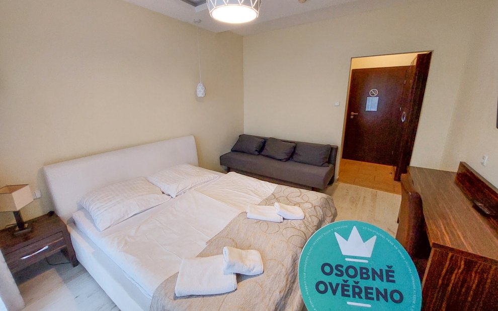 Dostaliśmy pokój z widokiem na ulicę i dużym balkonem, którym byliśmy zachwyceni. Wewnątrz znajdowało się podwójne łóżko, stolik nocny, kanapa, telewizor, biurko i krzesło oraz stolik na bagaż. W przedpokoju znajdowała się szafa na ubrania z dużą ilością wieszaków, mały stojak na buty i miejsce do przechowywania. Łazienka była wyposażona w prysznic i toaletę. Była drabinka grzewcza do odkładania ręczników i lustro. Brakowało mi trochę suszarki do włosów, która nie była wliczona w cenę.