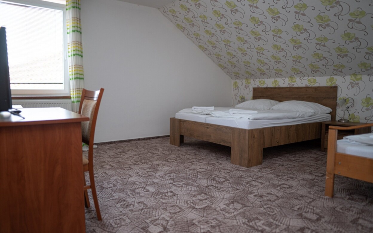 Pokój trzyosobowy ma powierzchnię 22 m² i może pomieścić maksymalnie 3 osoby z łóżkiem podwójnym i 2 łóżkami pojedynczymi.