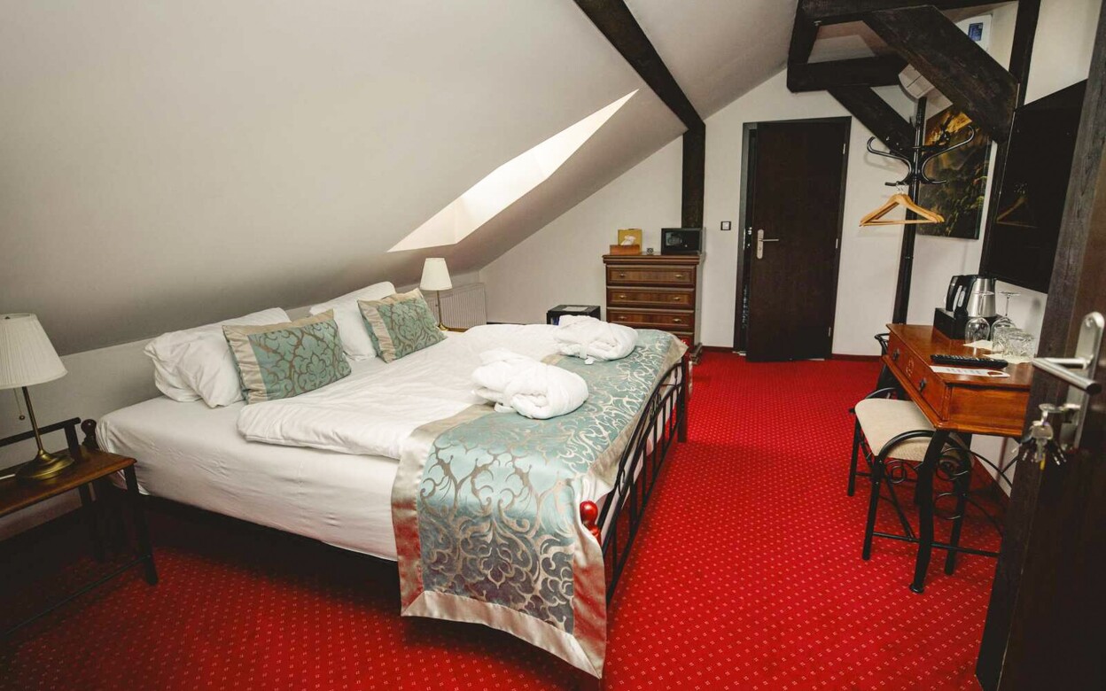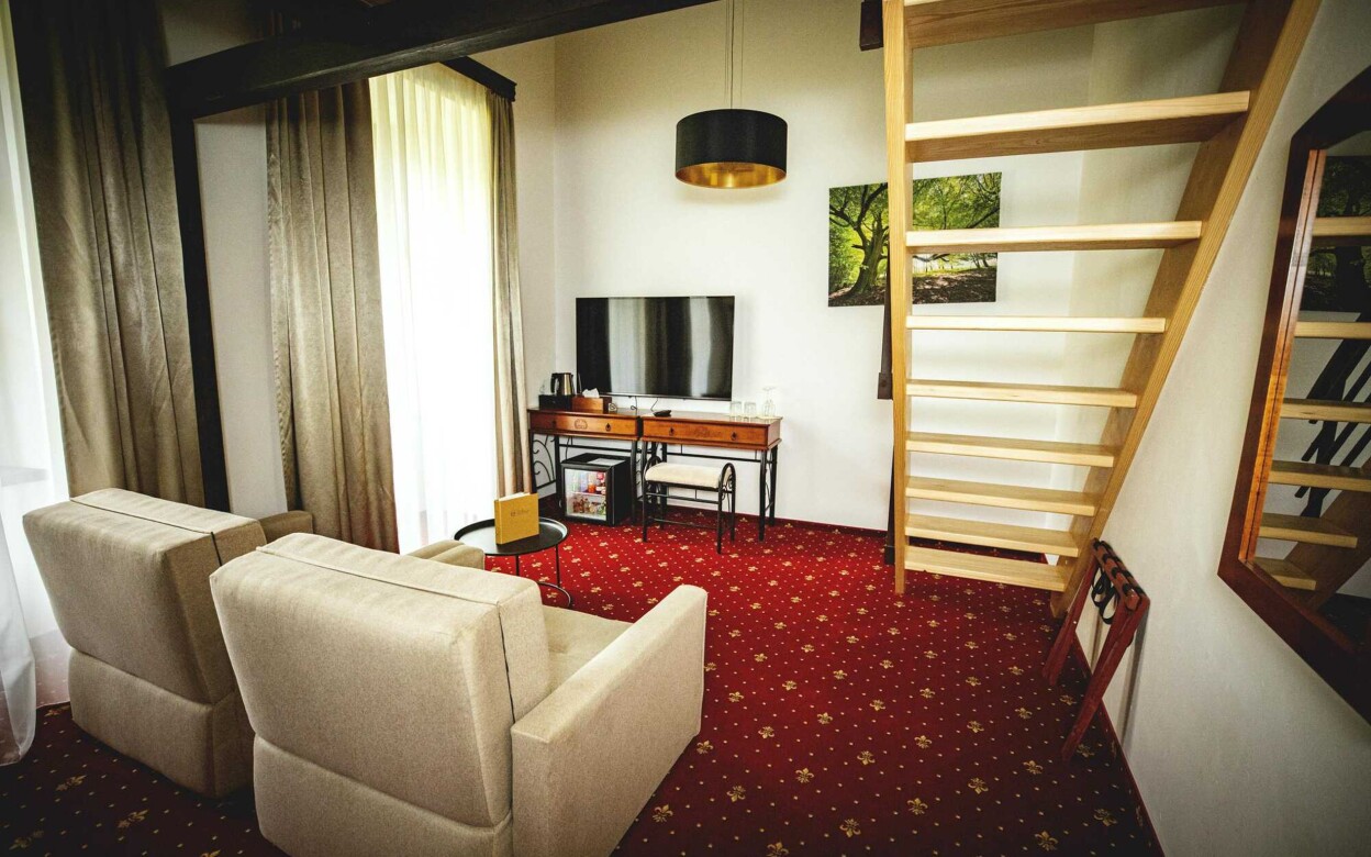 Dwupoziomowy pokój na poddaszu z sypialnią na piętrze jest przeznaczony dla dwóch osób z możliwością 2-4 dostawek i jest urządzony w nowoczesnym stylu. Wyposażenie obejmuje dostęp do WiFi, telewizor LCD, minibar oraz zestaw do parzenia kawy i herbaty. W łazience dla Gości przygotowano szlafroki i kapcie.
