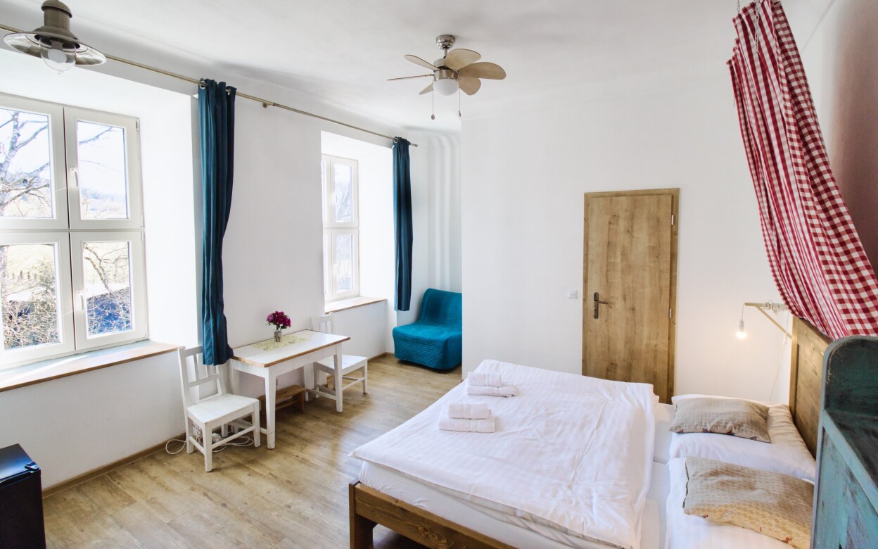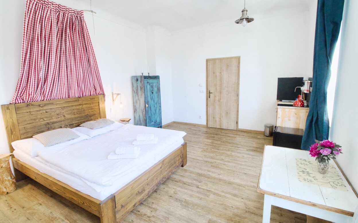 Pokój Tarasowy jest mniejszy (12 m²), ale nie umniejsza to jego przestronności. Zwłaszcza dzięki połączeniu z zewnętrznym tarasem, z którego roztacza się widok na ogród i pobliską wieżę widokową na Křížovej horze. W pokoju znajduje się paleta piętrowa dla 2 osób i łóżko pojedyncze.
