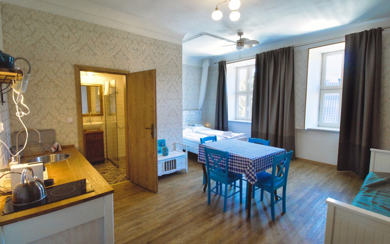 Apartament Provence to największy ze wszystkich pokoi, o powierzchni 38 m², z 4 pełnymi łóżkami lub łóżkiem podwójnym i palanquinem dla 2 osób. W pokoju znajduje się również stół i krzesła oraz aneks kuchenny z lodówką, płytą grzejną i ekspresem do kawy. Wnętrze jest urządzone w przytulnym, romantycznym stylu i będzie doskonałym miejscem dla rodzin i zakochanych par.
