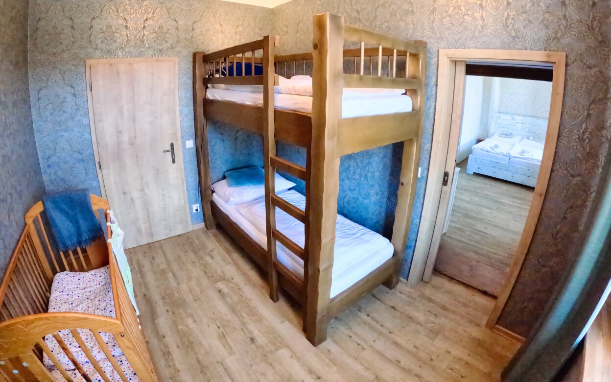 Drewniany pokój (25 m²) jest wyjątkowy dzięki podłodze sypialnej, z której można oglądać gwiazdy w nocy. Oczaruje również wnętrzem pełnym pachnącego drewna. Do 2 klasycznych łóżek można dołączyć do 3 dodatkowych łóżek, w tym rozkładaną sofę.