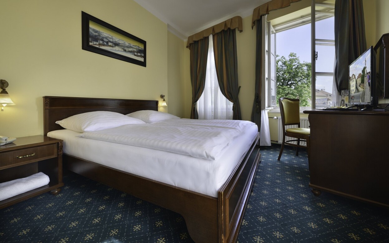 Zatrzymasz się w komfortowym, klimatyzowanym pokoju dwuosobowym (16 m²) z wnętrzem w stylu historycznym. Atmosferę doskonale podkreślają drewniane i tapicerowane meble, ozdobne zasłony czy dekoracje z epoki. Z okien roztacza się widok na Most Karola, Hradczany lub Zamek Praski.