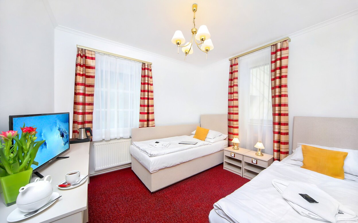 Będziesz mieszkać w wygodnym, przytulnym, nowocześnie wyposażonym pokoju dwuosobowym Standard. Jest on wyposażony w łóżko podwójne lub dwa łóżka pojedyncze, telewizor, biurko z krzesłem, zestaw do parzenia kawy i herbaty, sejf oraz łącze WiFi. Do dyspozycji jest również łazienka z prysznicem, toaletą i suszarką do włosów.