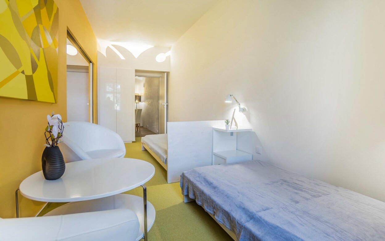 Apartament Rodzinny Jilm składa się z dwóch oddzielnych pokoi, jednego z podwójnym łóżkiem, drugiego z dwoma pojedynczymi łóżkami oraz jadalni. W każdej sypialni znajduje się również stół z miejscem do siedzenia, a łazienka wyposażona jest w wannę.