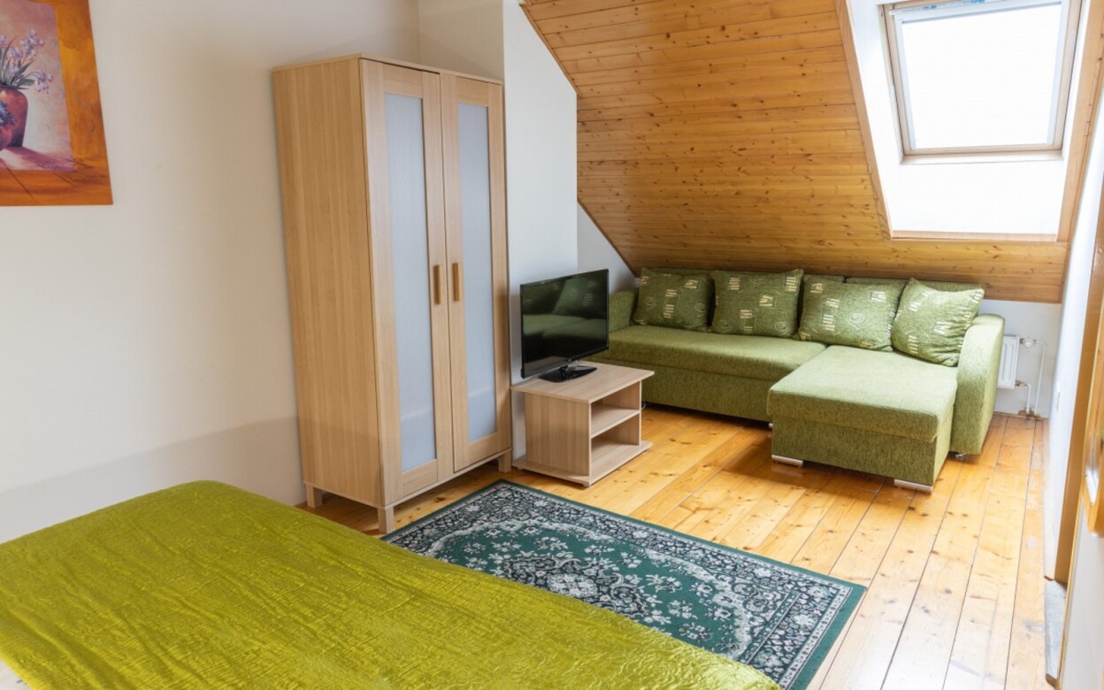 Apartament z narożną łazienką wyposażony jest w łóżko podwójne i rozkładaną sofę.