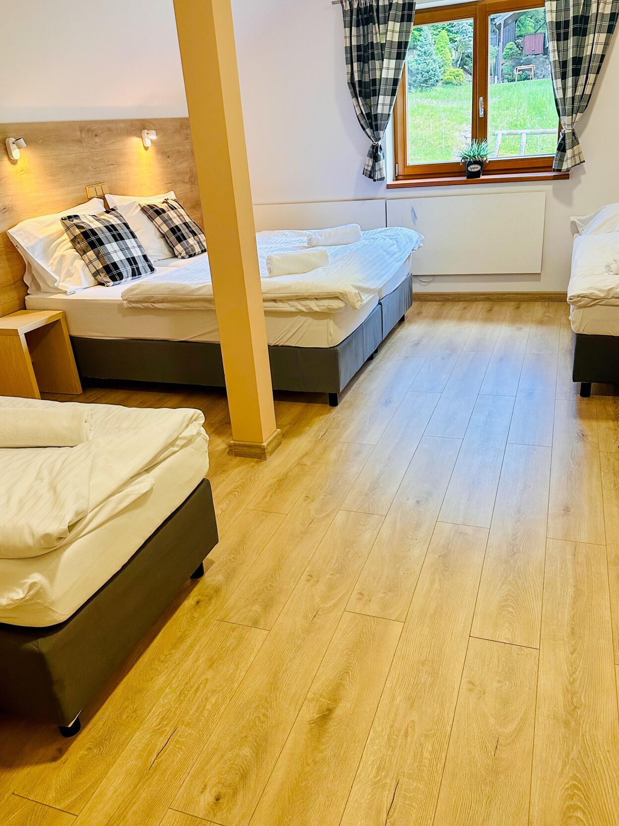 Pokoje Comfort są bardziej przestronne (17-22 m²) i odpowiednie dla 4-5 osób. Oferują 4 łóżka (2 można połączyć w łóżko podwójne) lub 3 łóżka i rozkładaną sofę.