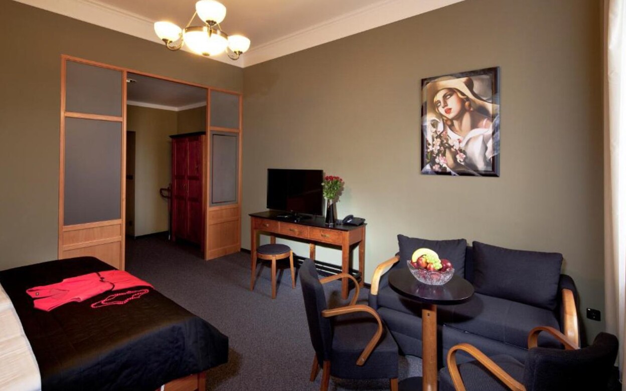 Apartament ma powierzchnię 20 m² i wyposażony jest w podwójne łóżko oraz część wypoczynkową z sofą i fotelami.