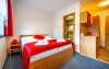 Pokój dwuosobowy na piętrze z dodatkowym łóżkiem ma powierzchnię 18 m² i obejmuje część sypialną z podwójnym łóżkiem oraz aneks kuchenny ze stołem.