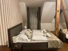 Pokój Superior oczaruje romantyczną atmosferą. Oprócz podwójnego łóżka, zawsze znajdziesz pojedyncze łóżko lub rozkładaną sofę, która może służyć jako dodatkowe łóżko. Całkowita pojemność pokoju wynosi zatem 3 osoby.