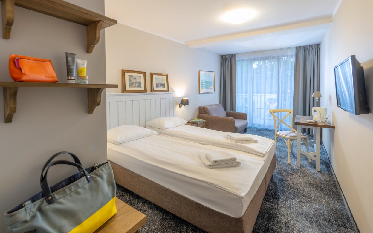 - Pokój Classic znajduje się w sąsiednim budynku i jest wygodną opcją dla par. Pokój ma powierzchnię 14 m² i wyposażony jest w podwójne łóżko oraz toaletkę. Pokój wychodzi na zachód i ma dostęp do balkonu lub tarasu.
