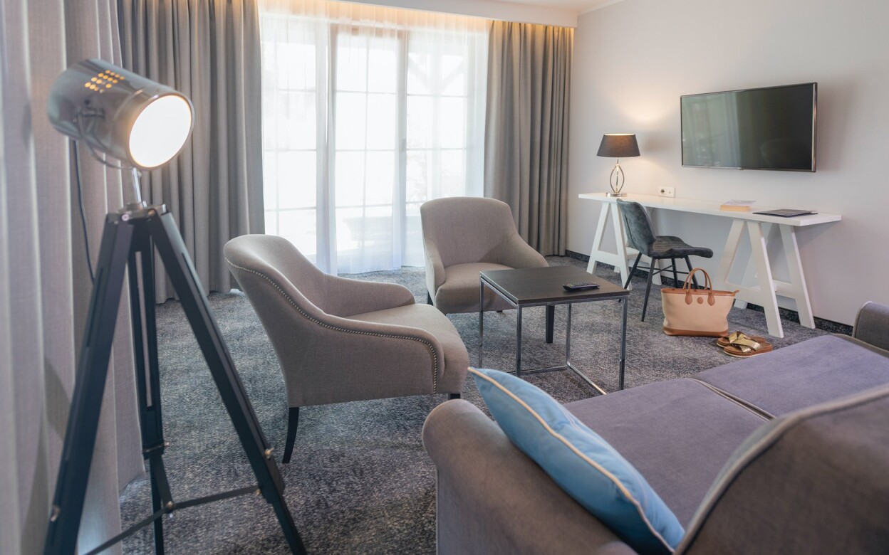 Pokój Comfort znajduje się w sąsiednim budynku połączonym z budynkiem głównym. Pokój ma 21 m² powierzchni, podwójne łóżko i sofę, dzięki czemu może wygodnie pomieścić do 4 osób. Te wychodzące na wschód pokoje mają dostęp do balkonu lub tarasu.