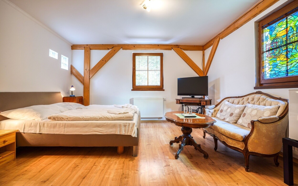 Zatrzymasz się w stylowym pokoju o rustykalnym wystroju, który idealnie wpasowuje się w ogólny wystrój pensjonatu. Każdy hotel posiada prywatną łazienkę z prysznicem i toaletą, telewizor oraz łącze Wi-Fi.
