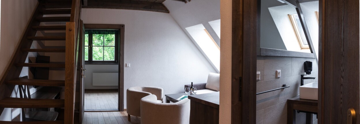 Pokój dwuosobowy ma powierzchnię 26 m² i wyposażony jest w 2 łóżka (które można rozdzielić lub połączyć w łóżko podwójne) oraz niewielką część wypoczynkową z fotelami.