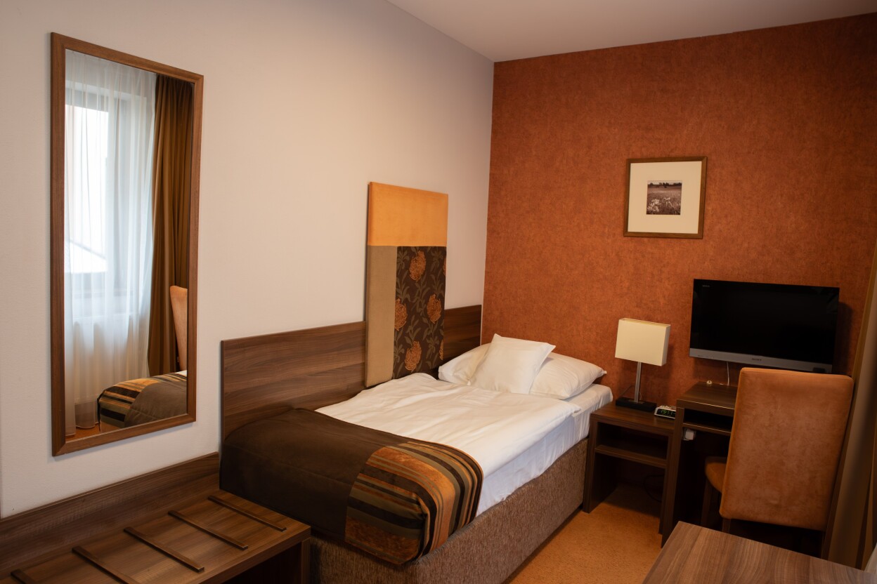 Pokój Twin o powierzchni 20 m² wyposażony jest w 2 łóżka pojedyncze, biurko i mały stolik z częścią wypoczynkową.
