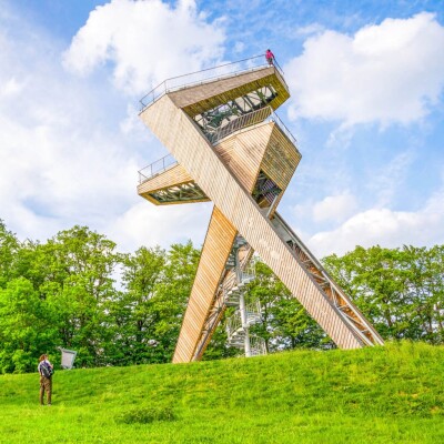 Punkt widokowy Salaš składa się z metalowej konstrukcji z drewnianymi panelami. Jej kształt przypomina dwie "szczęśliwe" siódemki wbite jedna w drugą. Dwie siódemki obejmują platformę widokową. Po wspięciu się po 112 stopniach na wysokość 20 m lub 15 m można podziwiać odległy widok na Velehrad, Uherské Hradiště, szczyty Białych Karpat lub Chřiby**.