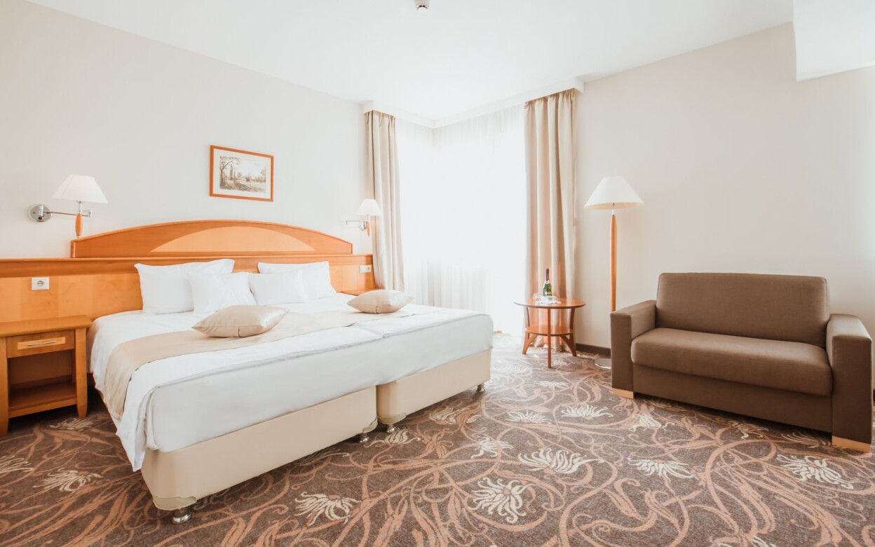 Pokój dwuosobowy lub pokój dwuosobowy Superior: pokoje dwuosobowe lub typu twin wyposażone są w część wypoczynkową, szafę, biurko i telewizję satelitarną. Goście mogą korzystać z sejfu, minibaru i bezpłatnego WiFi. Do pokoju można wstawić maksymalnie 2 dodatkowe łóżka.